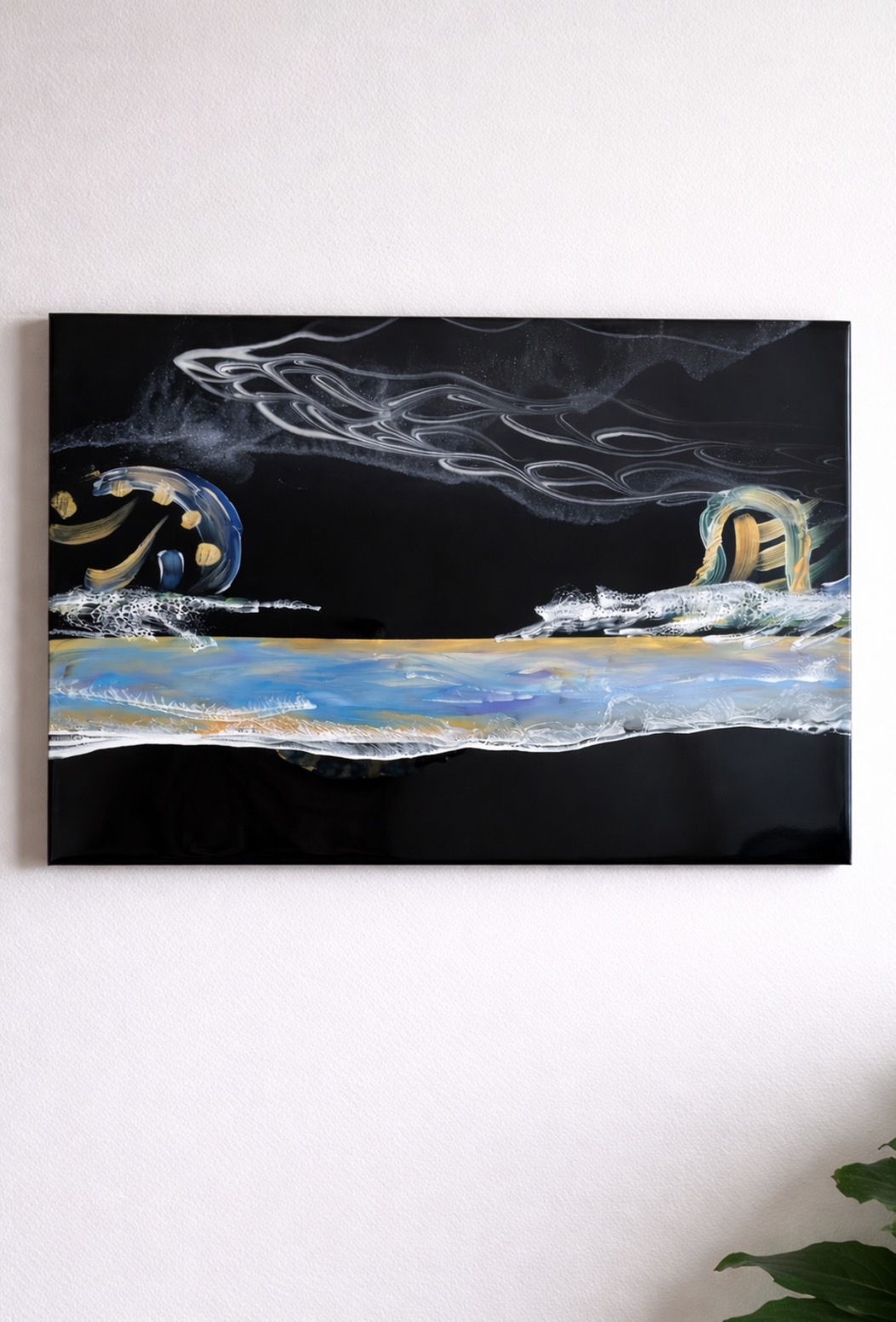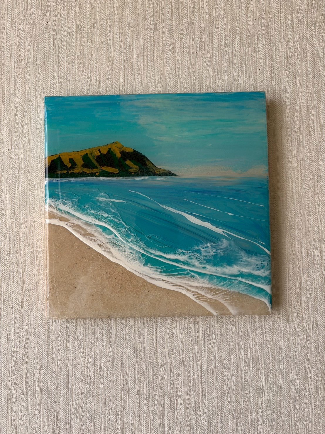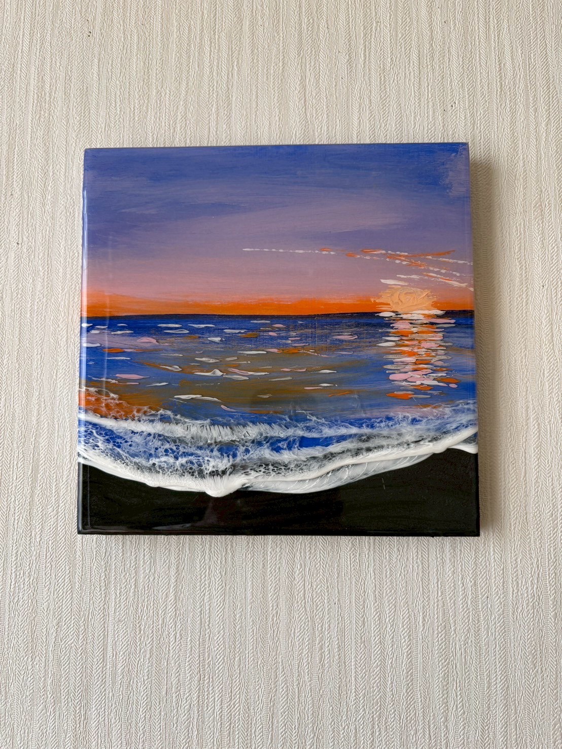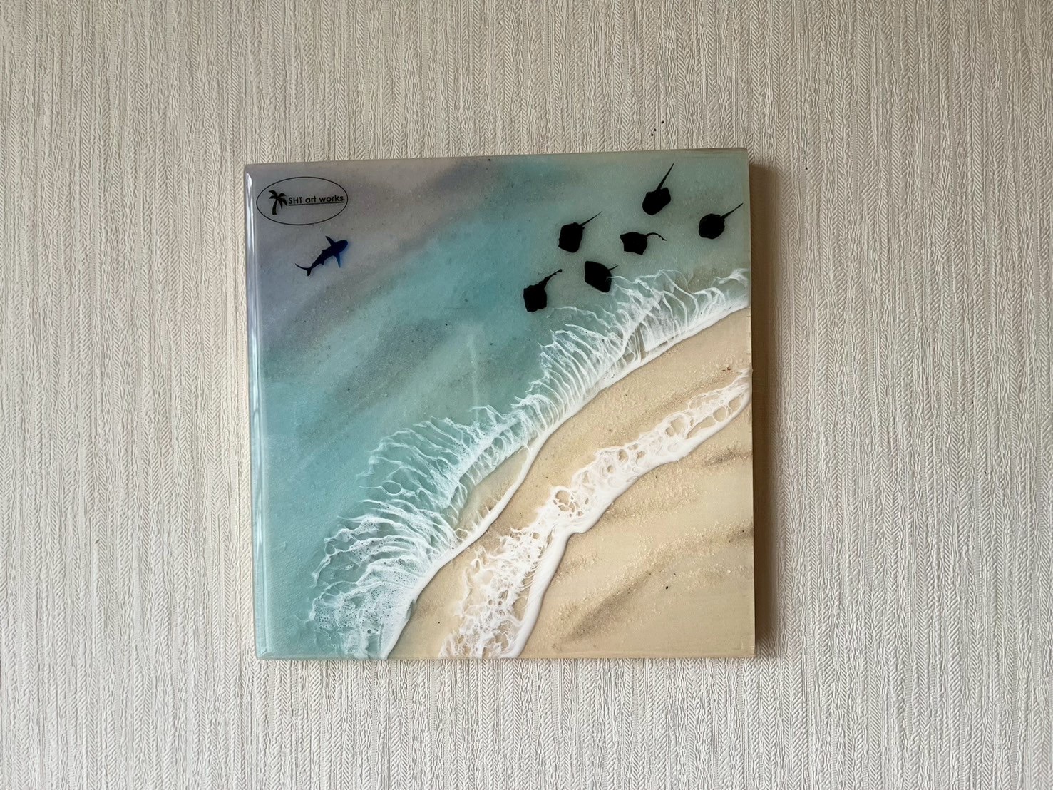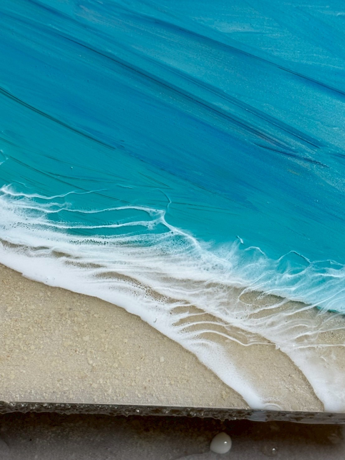 アクリル絵の具や顔料、エポキシレジンを使って海を表現しています