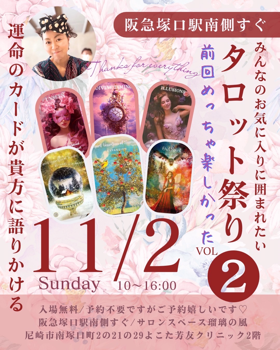 11月2日 タロット祭り 2025.10.20 10:00〜16:00 タロット祭りですが、霊視鑑定もやってます♡たくさんの占い師が集まり、可愛い物販もたくさんありますよ〜🤗💕 皆さん、ぜひ遊びに来てください〜!お待ちしています♡ ご予約はこちらから