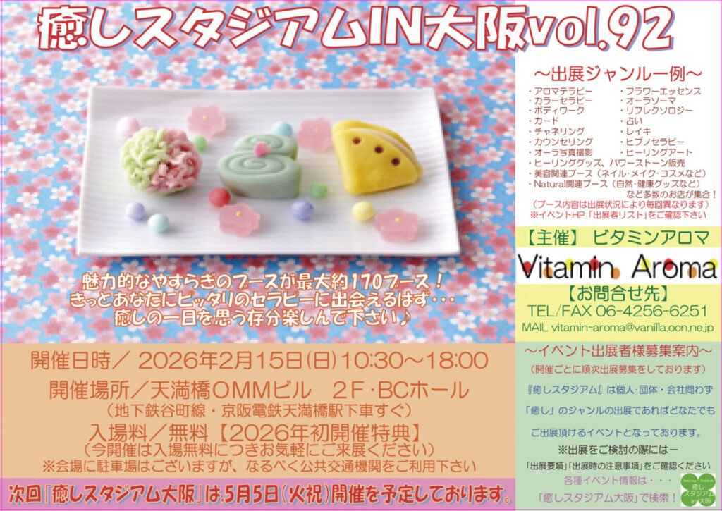 2月15日 癒しスタジアム 2025.12.28 魅力的な安らぎのブースが約170ブースも並びます!その中で、今回は仲間たちと5ブースを連ねて、皆さまをお迎えいたしますぜひ遊びにお越しください♡ お待ちしております ※2月開催の癒しスタジアムは入場無料です ご予約はこちらから