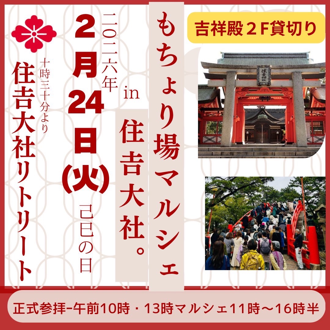 2月24日 もちょり場マルシェ 住吉大社 2025.12.30 住吉大社 吉祥殿2階10:00〜16:30 大規模マルシェです。とても広い住吉大社の吉祥殿を貸切り、たくさんの出店者が集います! ぜひ遊びにお越しください〜♡お待ちしております ご予約はこちらから